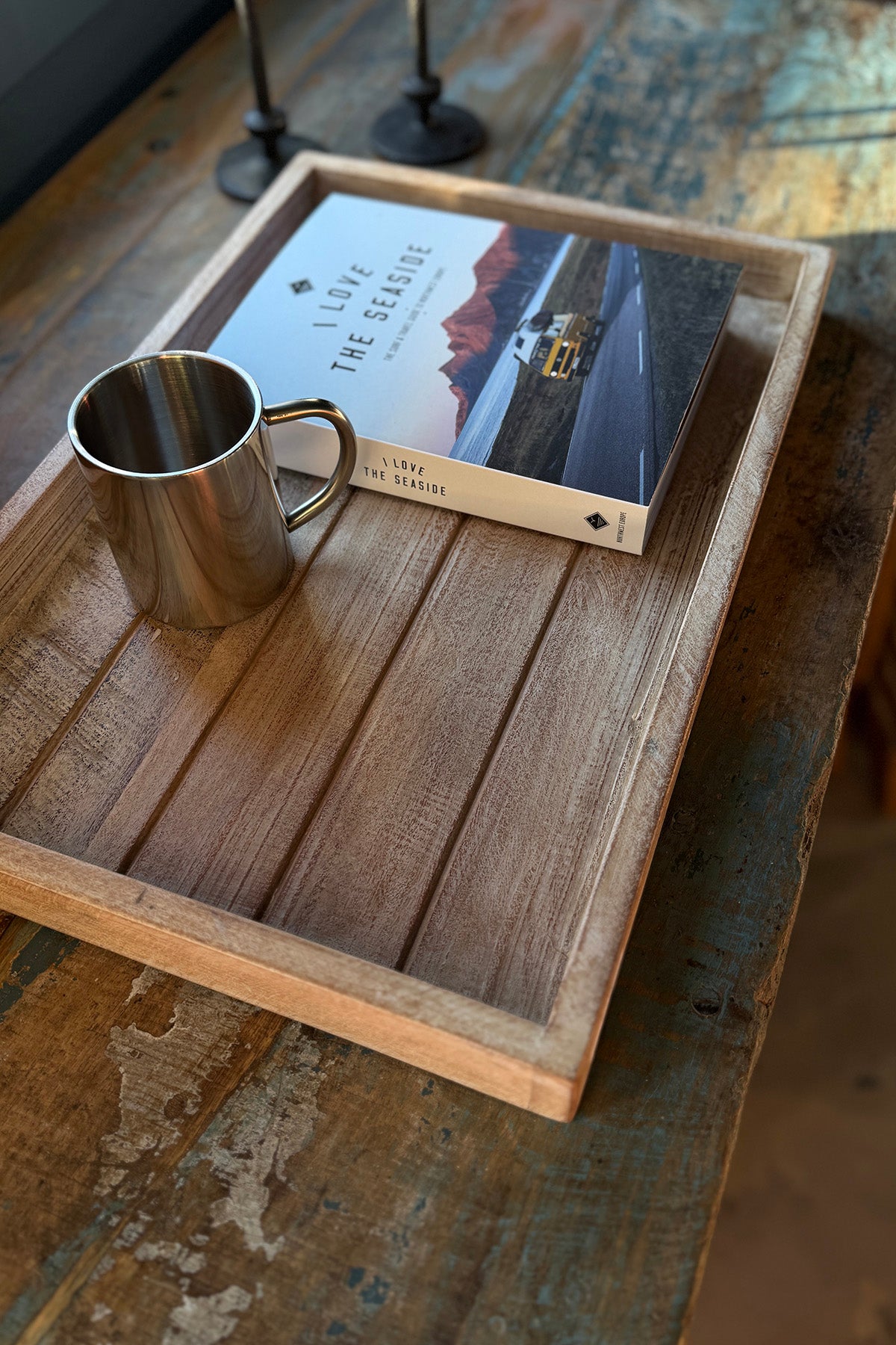 Bakke lavet af genbrugstræ. Kan benyttes som serveringsfad, et dekorativt element på stuebordet eller som en praktisk opbevaringsbakke i soveværelse.