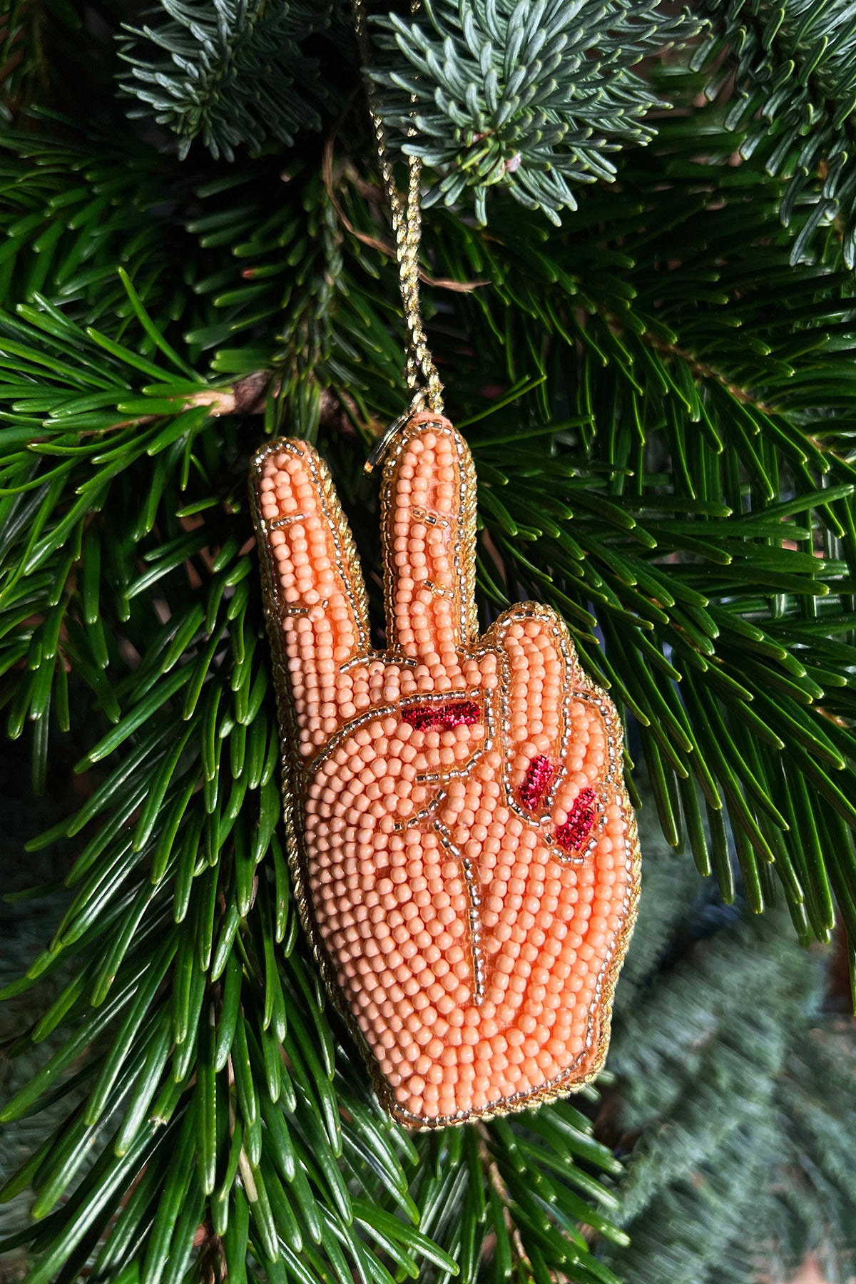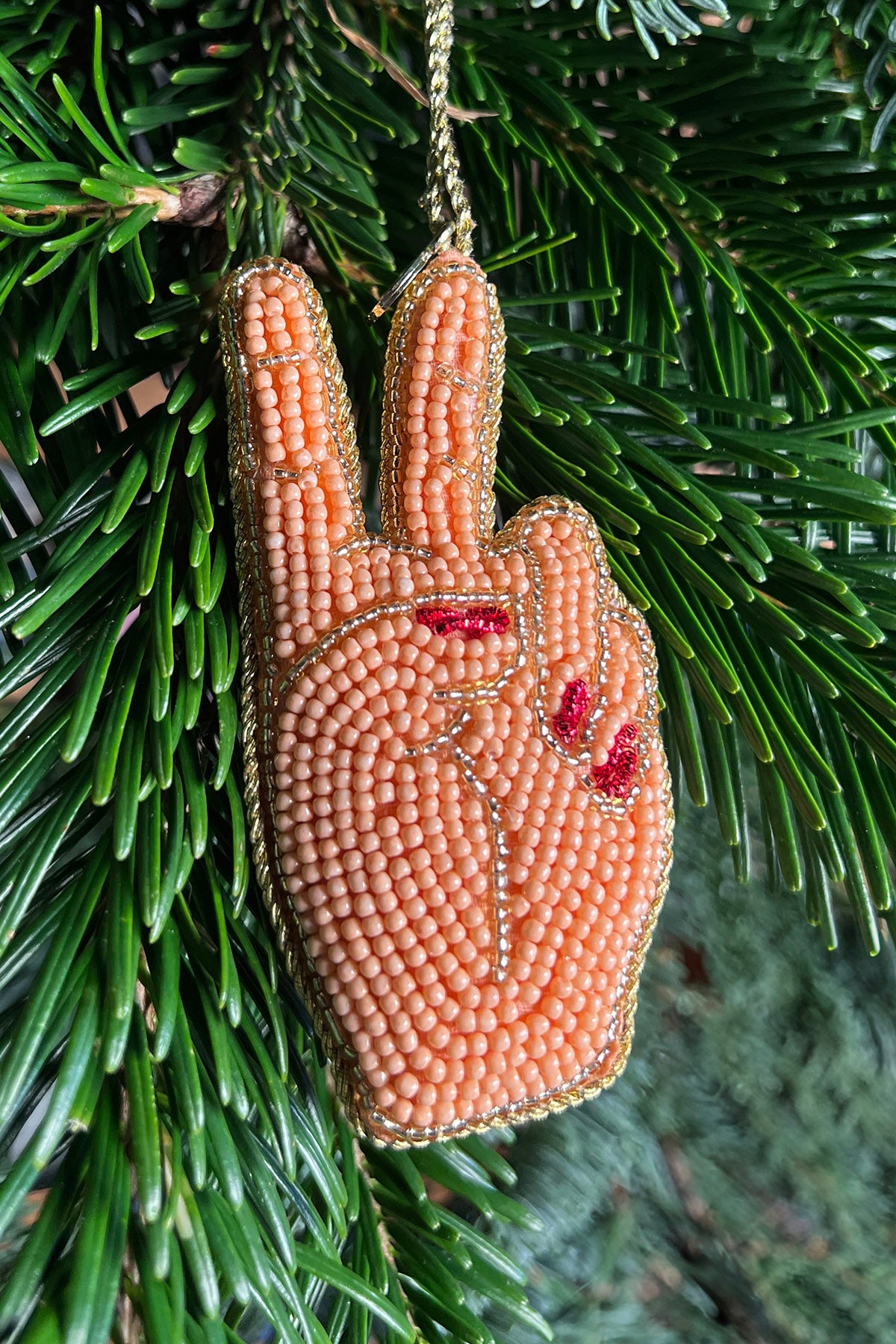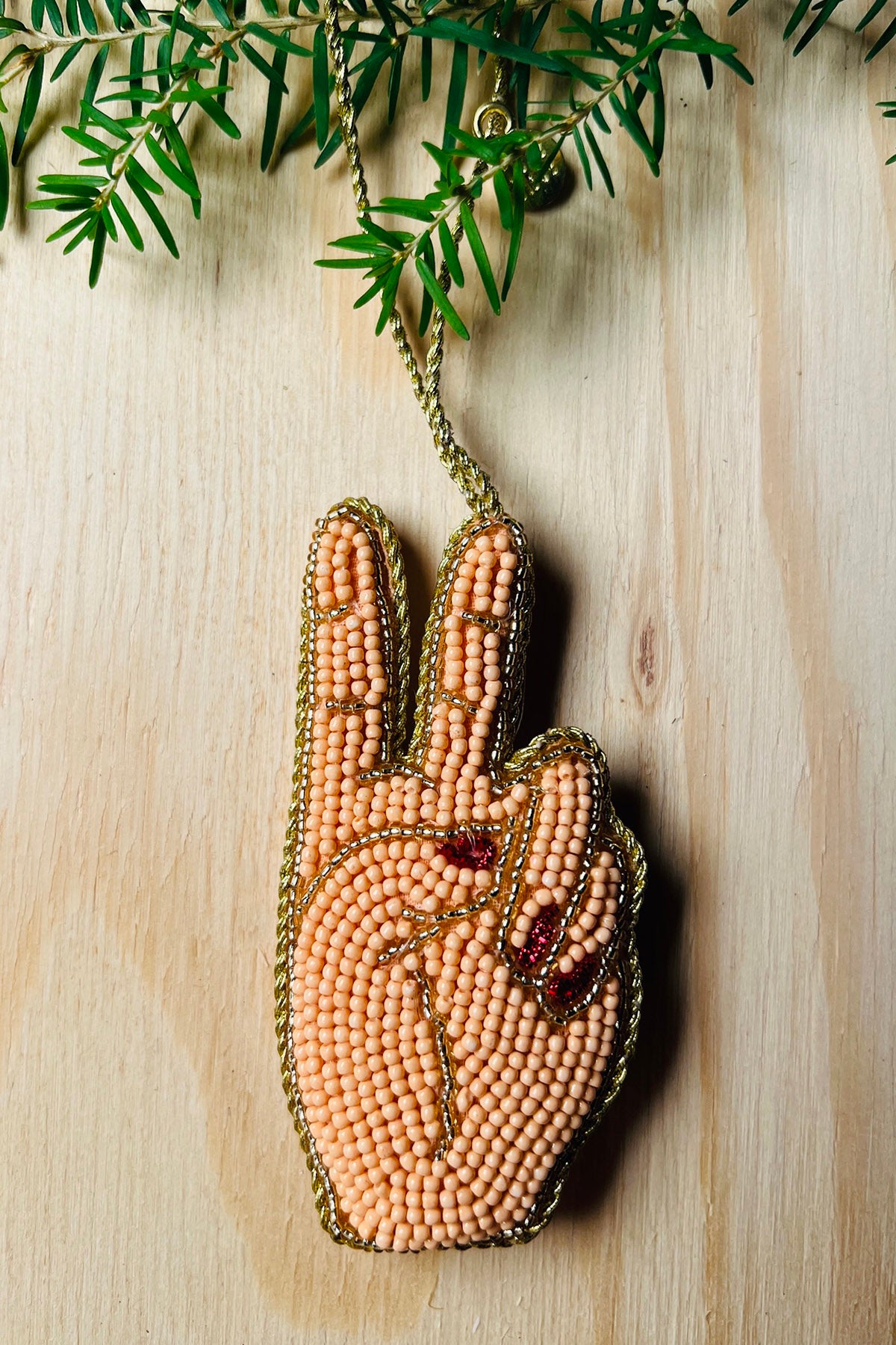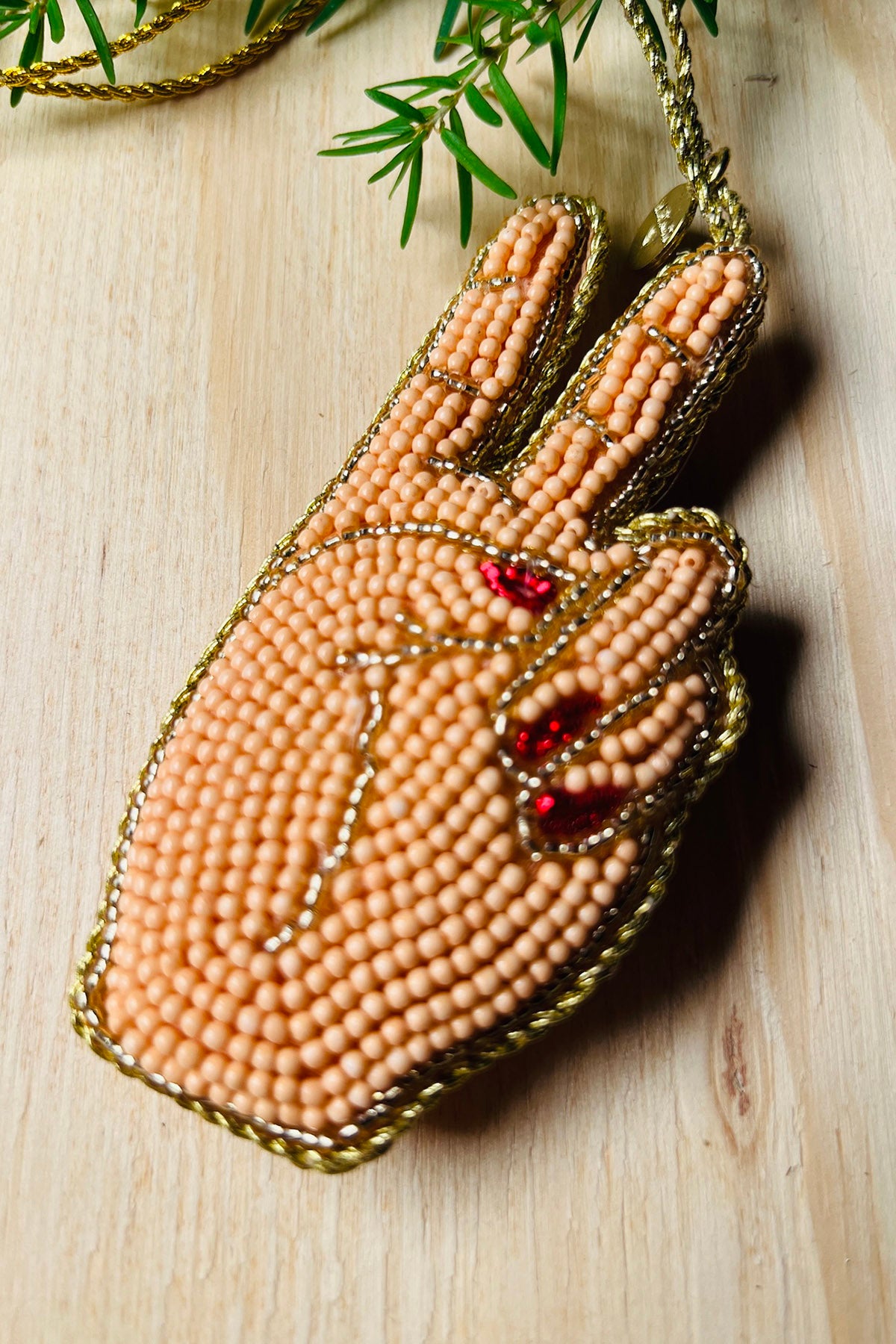 Lavet af håndfarvede glasperler med metallic-snor. Den er broderet ens på begge sider. Mål: 5 x 6 cm Materiale:Håndfarvede glasperler med metallic-snor