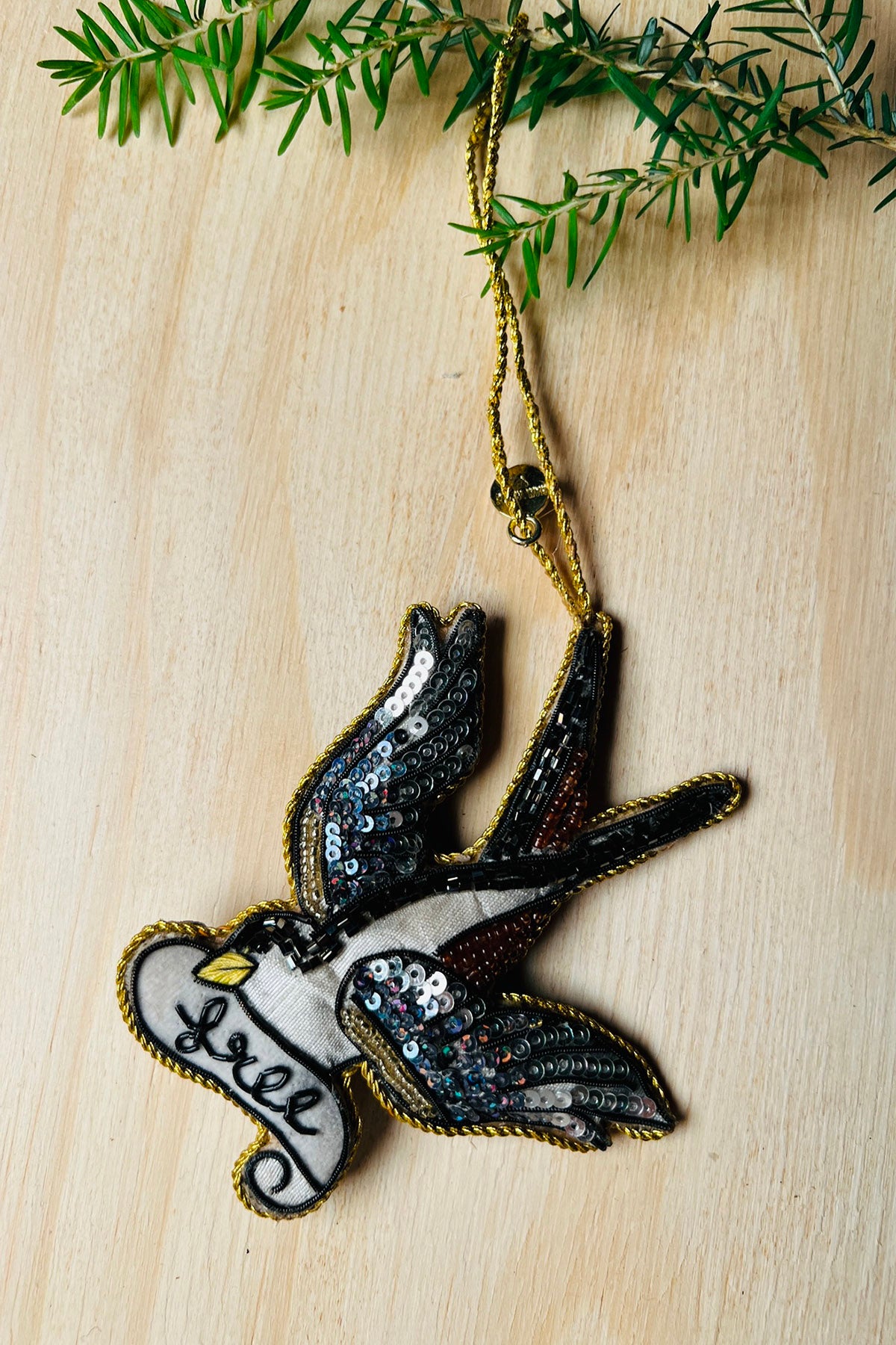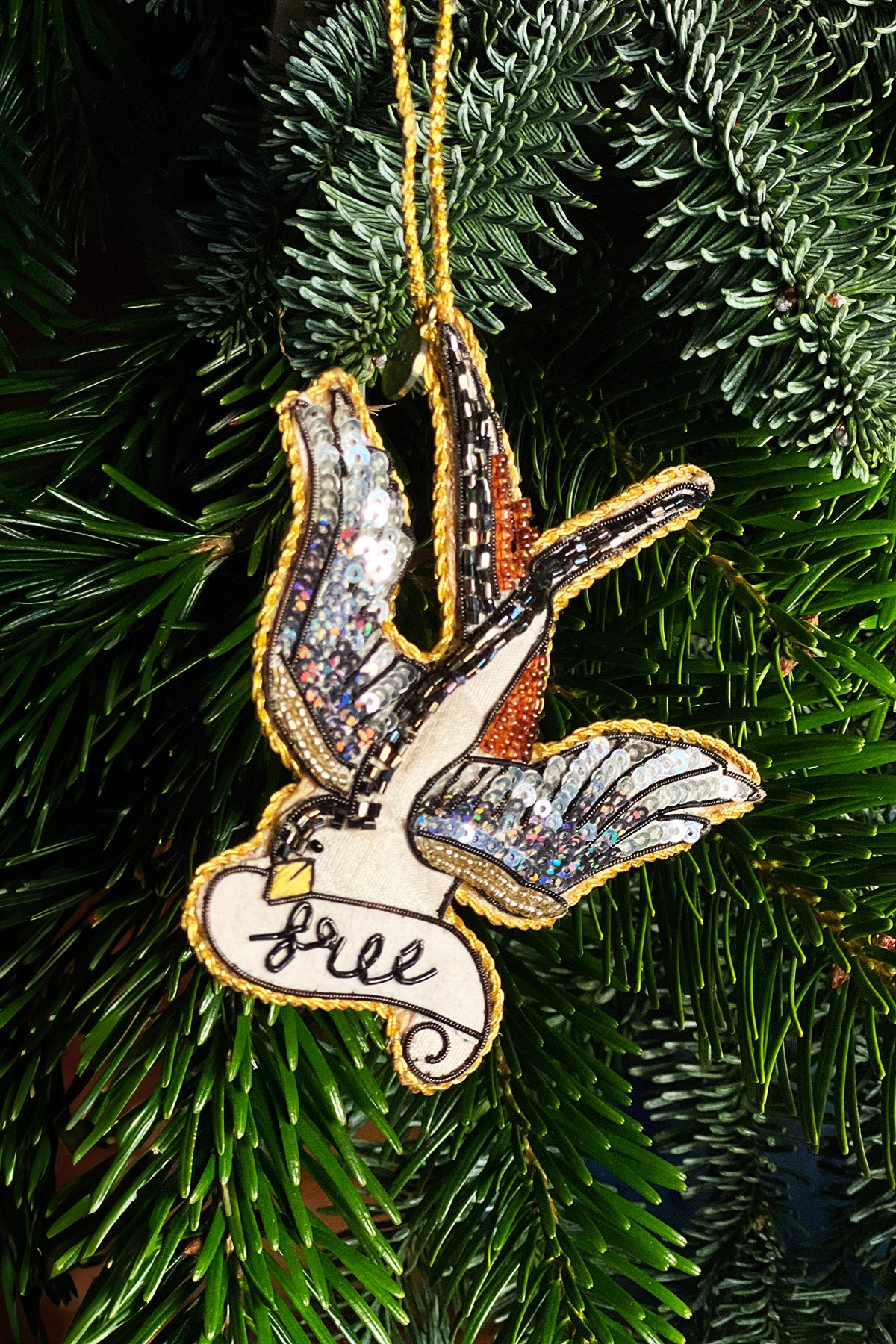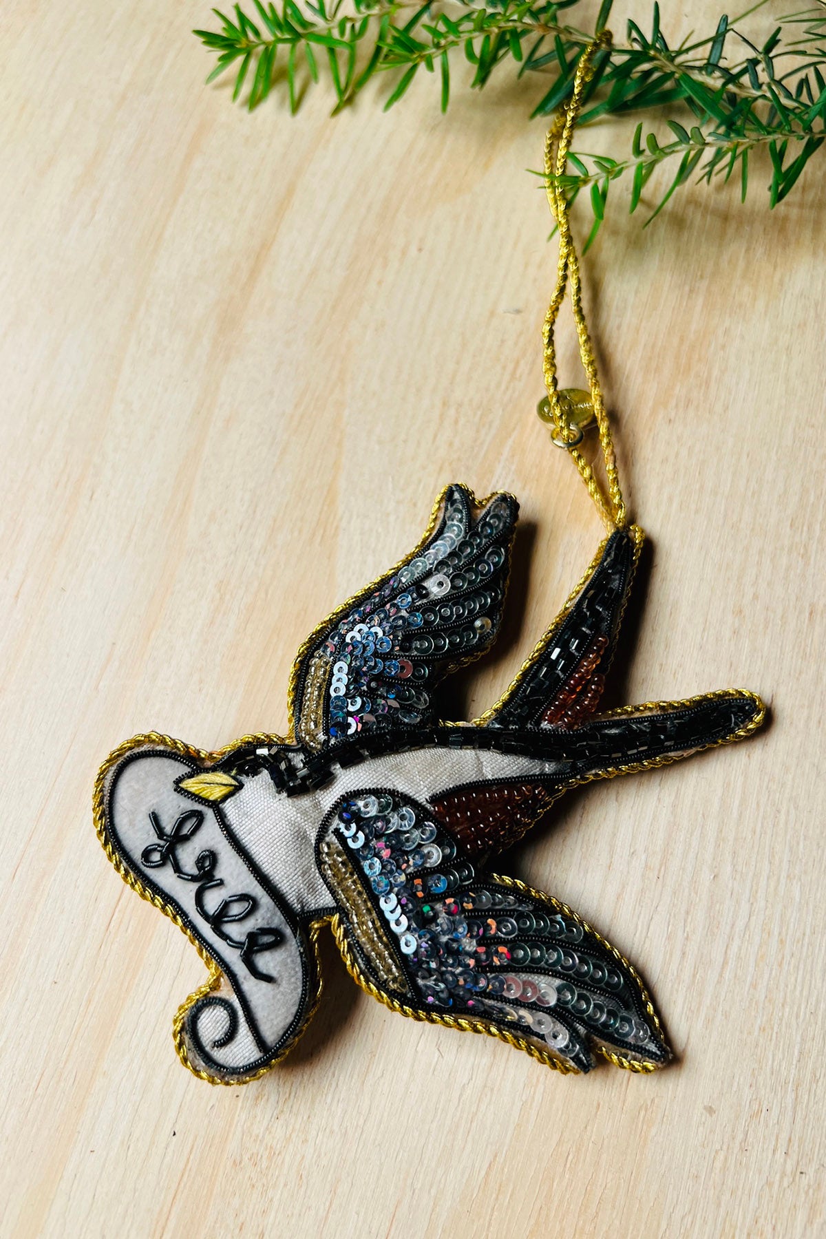 Lavet af håndfarvede glasperler med metallic-snor. Den er broderet ens på begge sider.