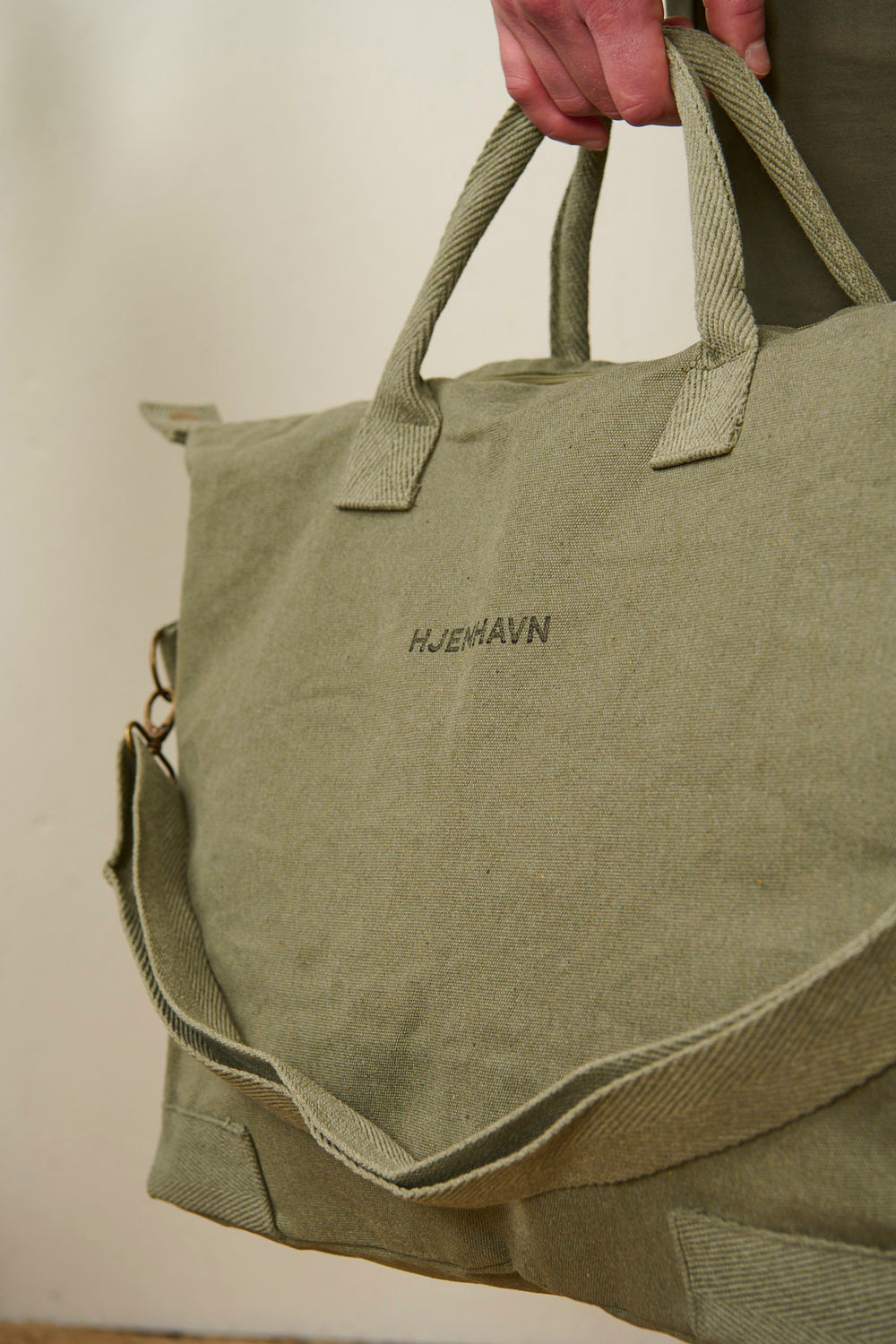 Weekend Bag aus robustem Recycling-Canvas (500 g/m²) mit Messingreißverschluss und -knöpfen.