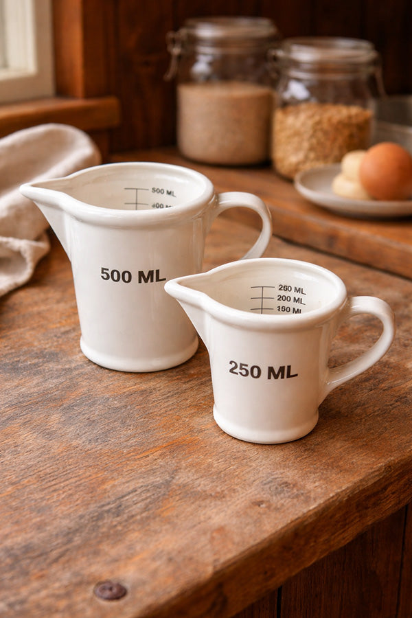 Retro measuring jugs in porcelain with nostalgic charm.