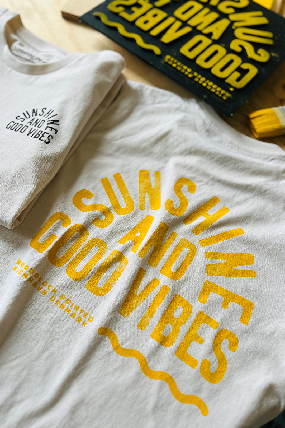 Vi håndtrykker efter ordre på old school manér med woodblock printing og serigrafi tryk. Dermed mindsker vi overproduktion og spild.