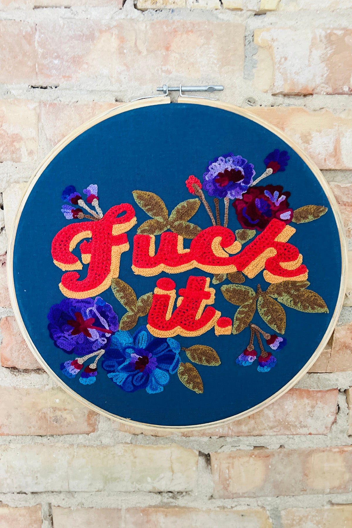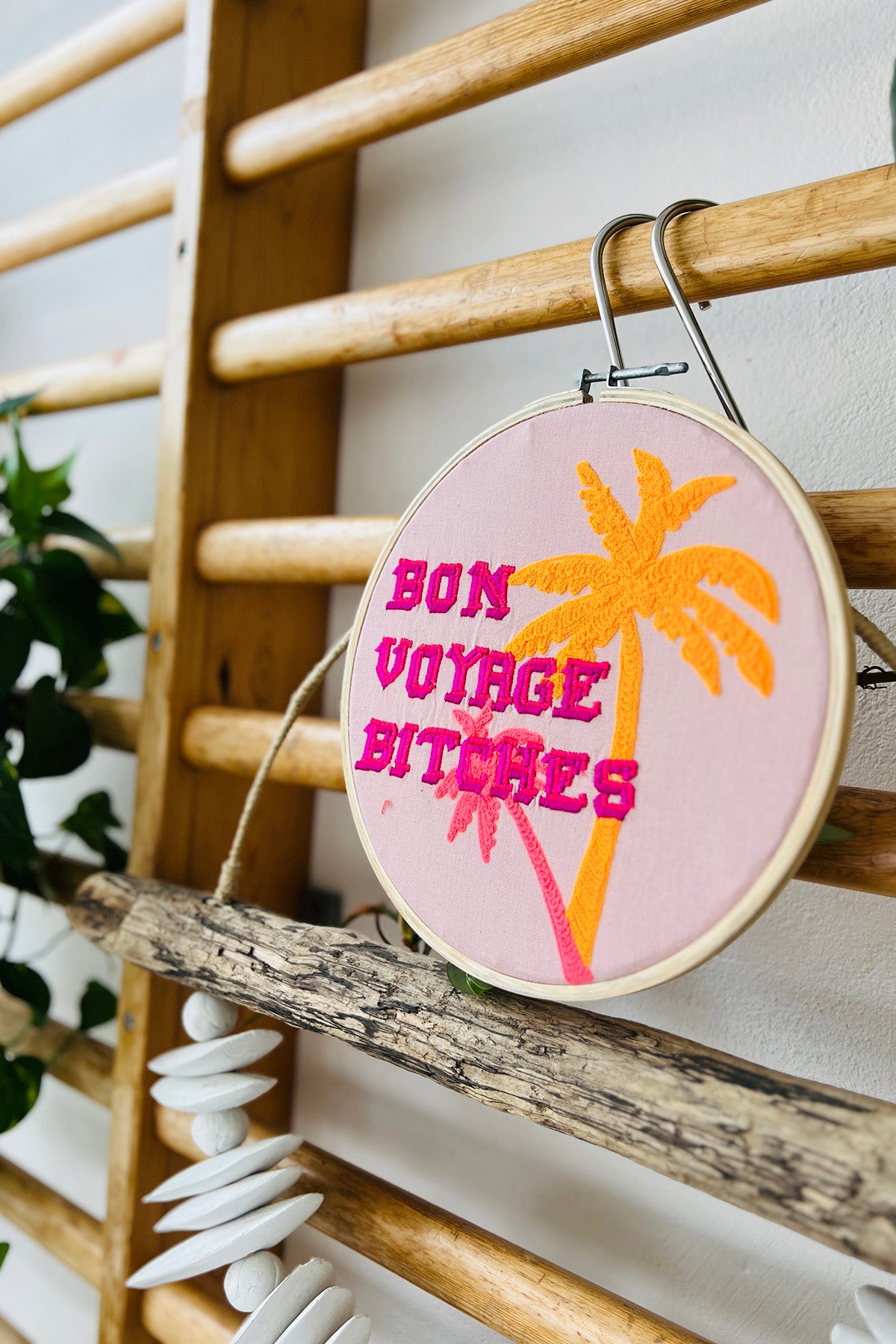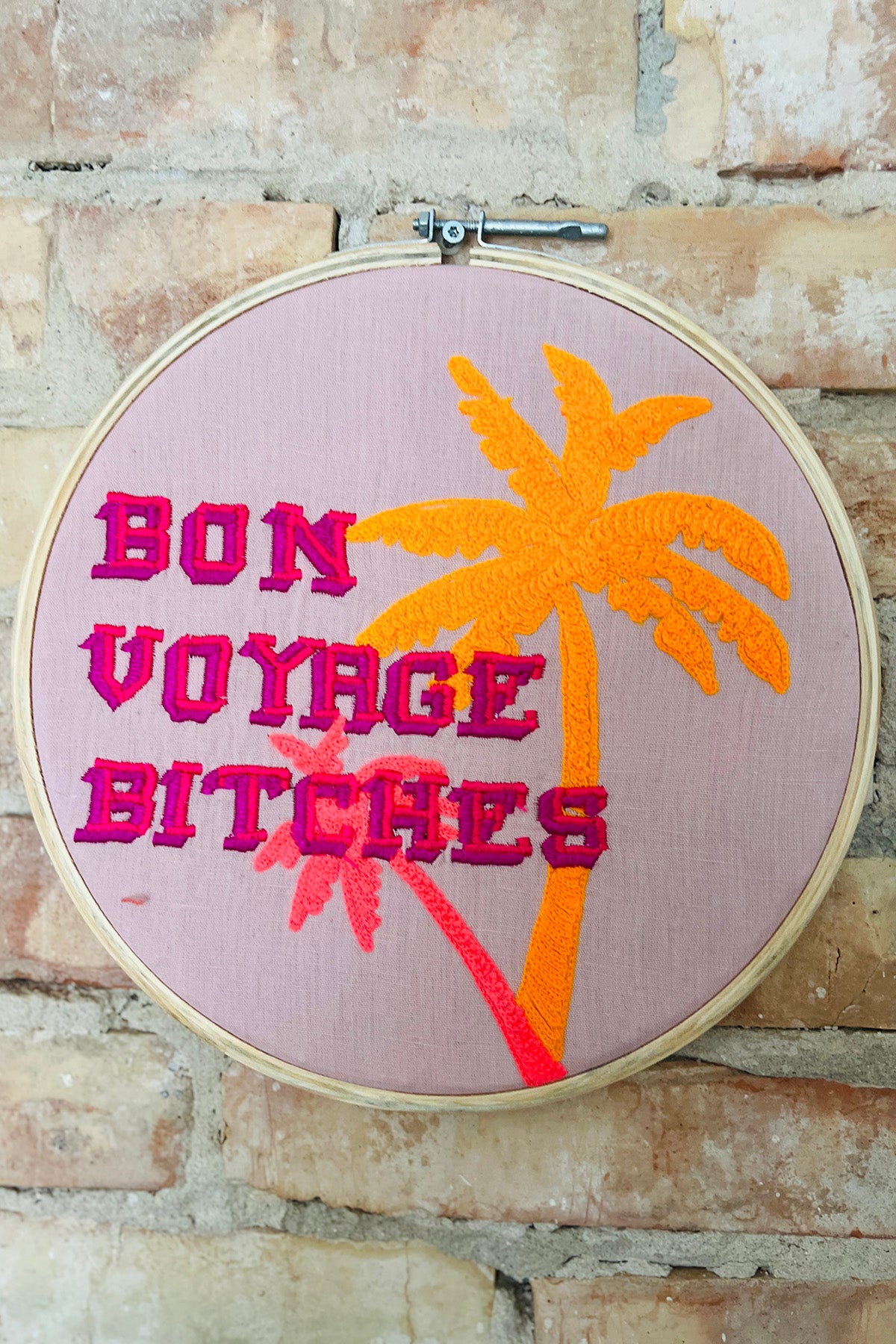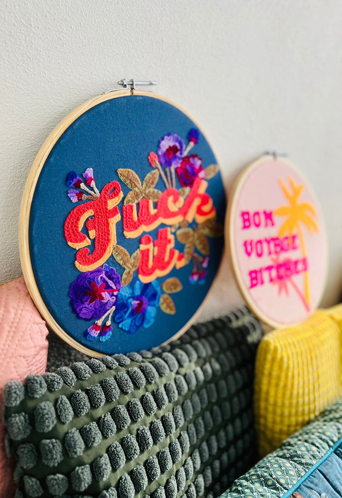 Farverigt broderi til væggen.Størrelser:Bon Voyages Bitches: Ø27 cmFlowers: Ø27 cmLobster: Ø27 cmFuck it: Ø32 cm